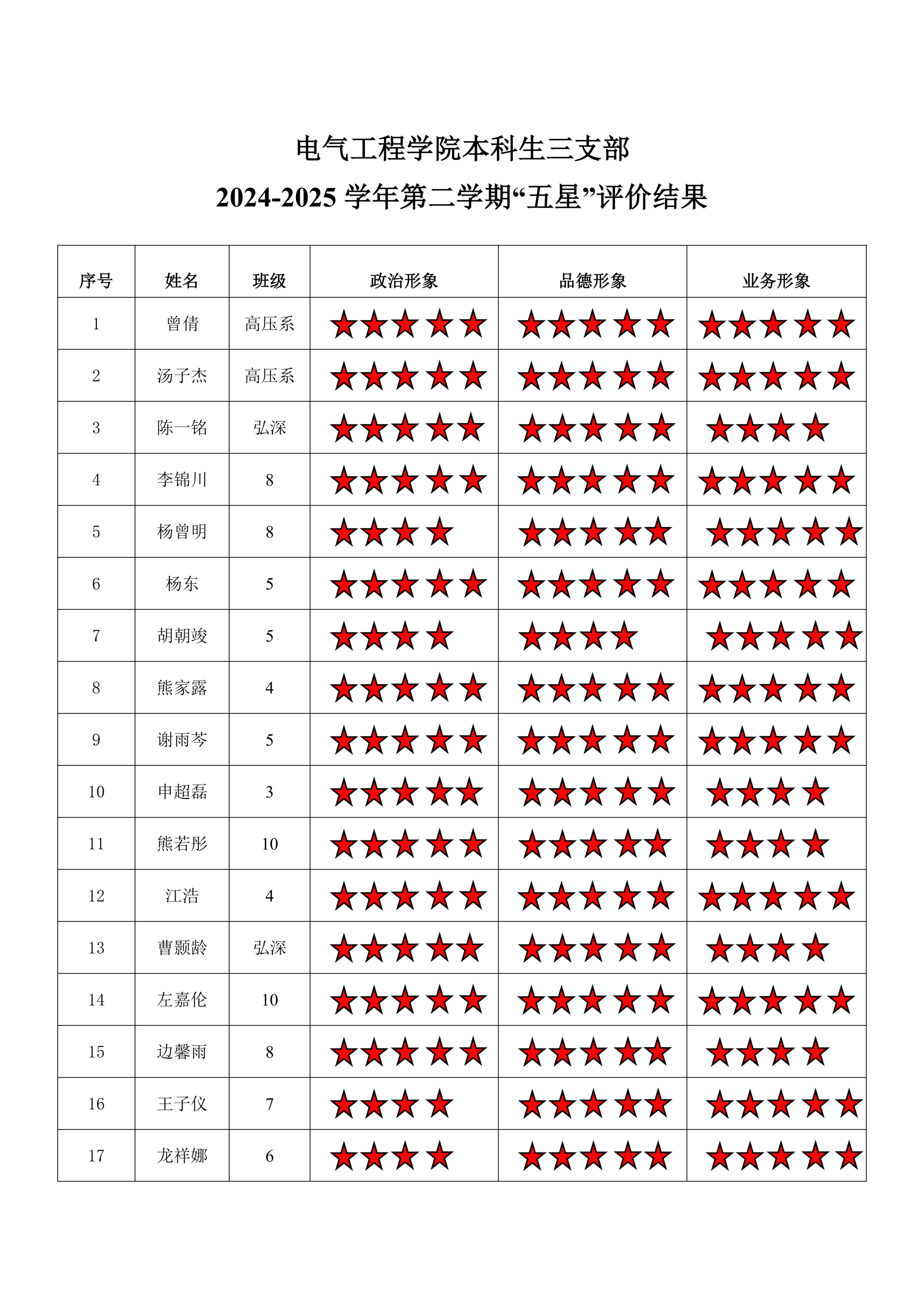 电气工程学院本科生三支部 2024-2025学年第二学期“五星”评价结果