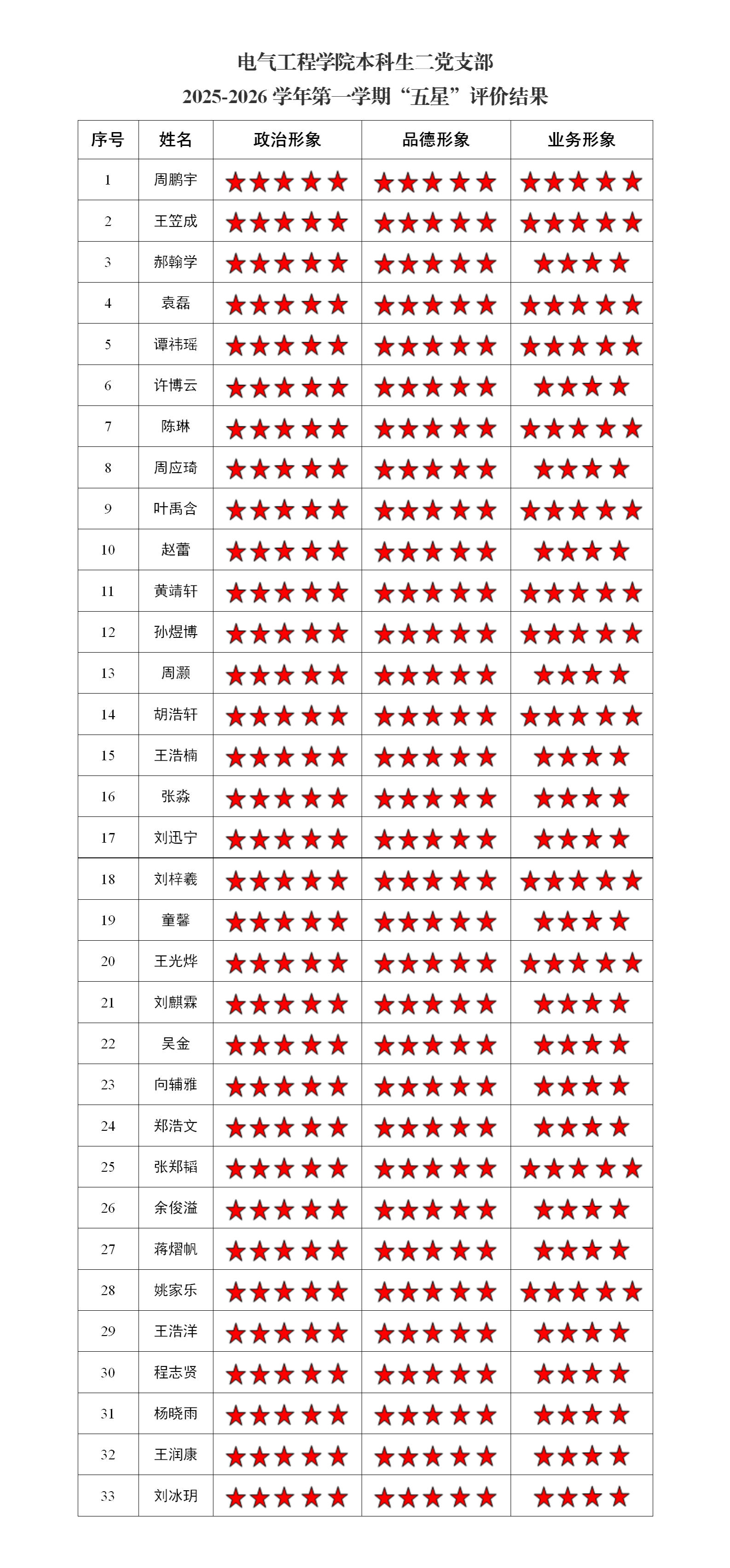 电气工程学院本科生二党支部2025-2026学年第一学期“五星”评价结果