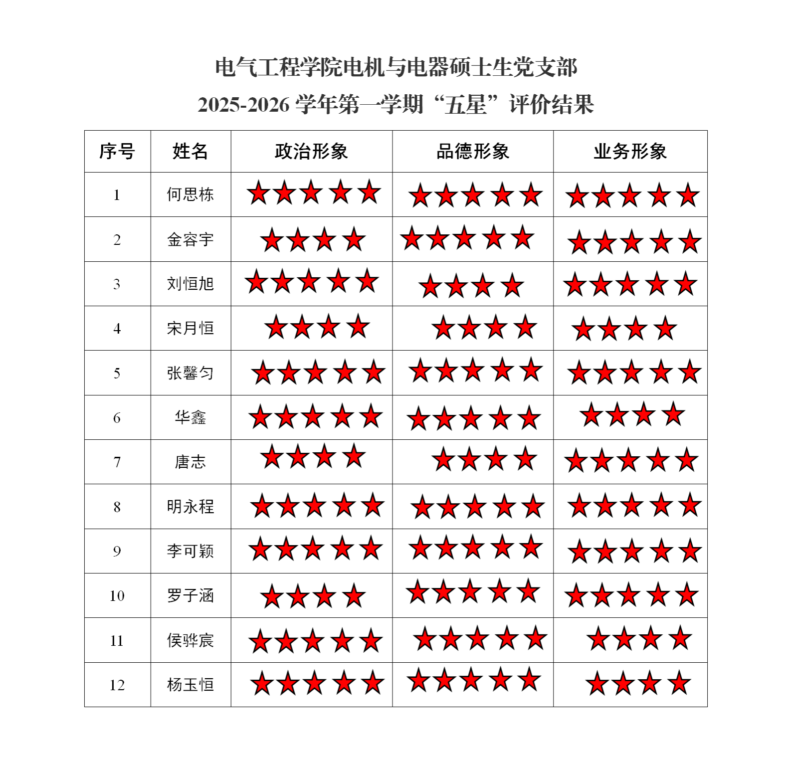 电气工程学院电机与电器硕士生党支部2025-2026学年第一学期“五星”评价结果