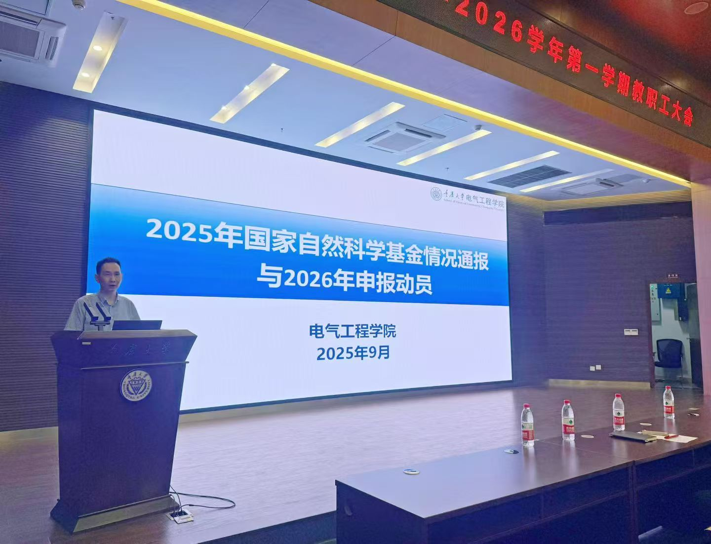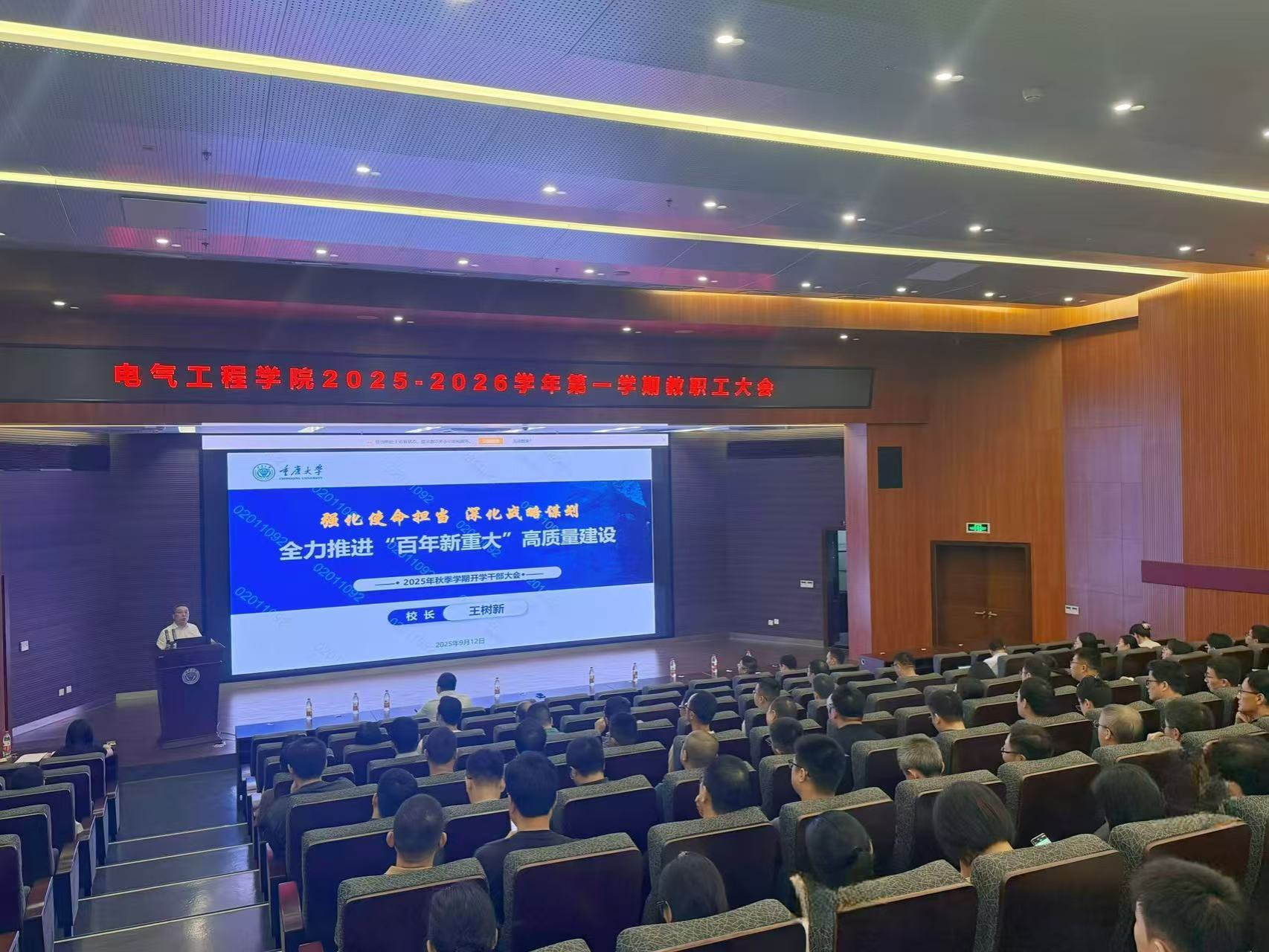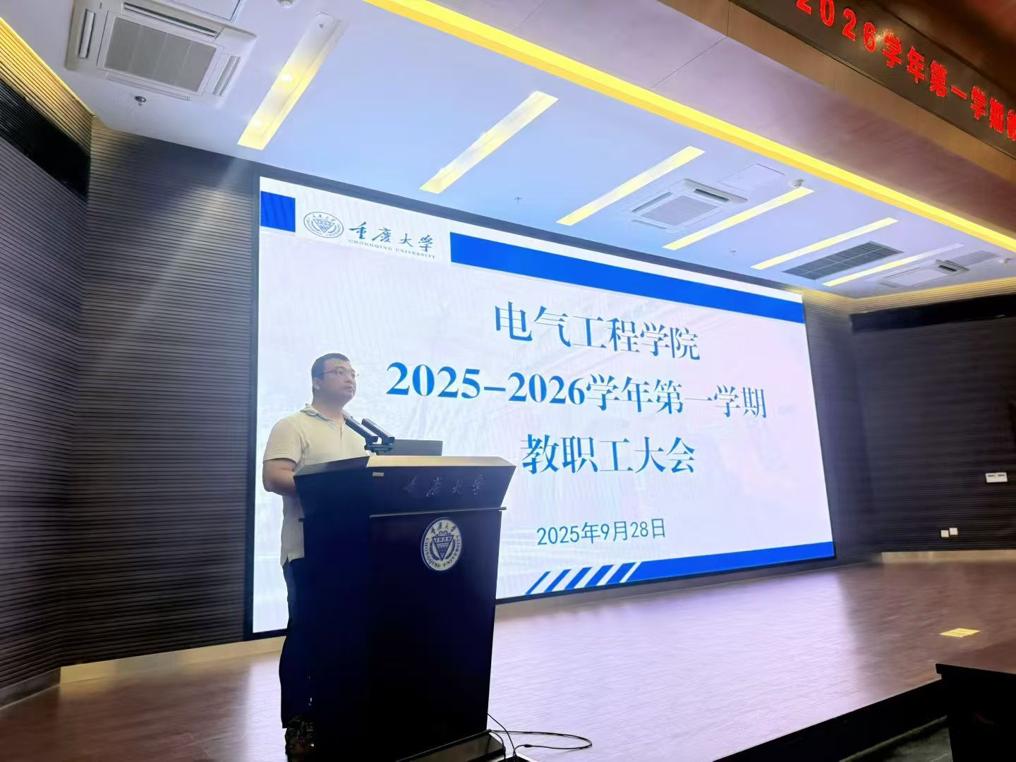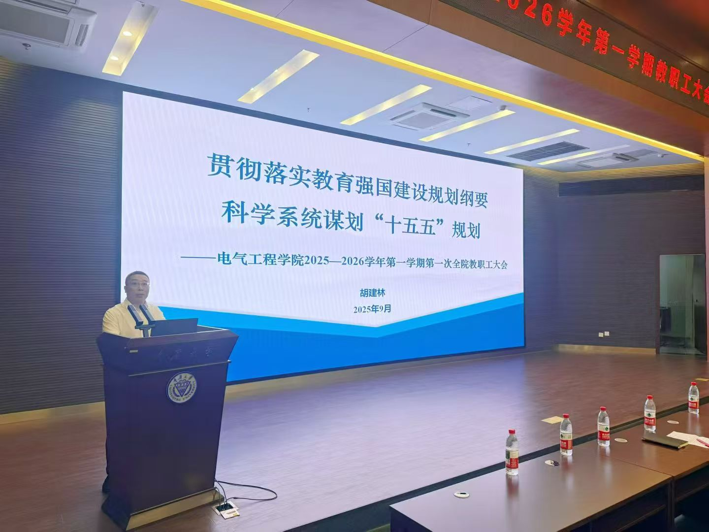 2025年9月28日上午,电气工程学院以“贯彻落实教育强国建设规划纲要 科学系统谋划‘十五五’规划”为主题,在科学城校区理科楼101报告厅召开2025-2026秋季学期教职工大会。学院党委书记胡建林,副书记王晓静,副院长杜雄、杨鸣、王强钢,全国重点实验室副主任李辉、曾礼强,雪峰山野外站副站长张志劲以及学院教职工参加了本次会议。大会由王晓静主持。