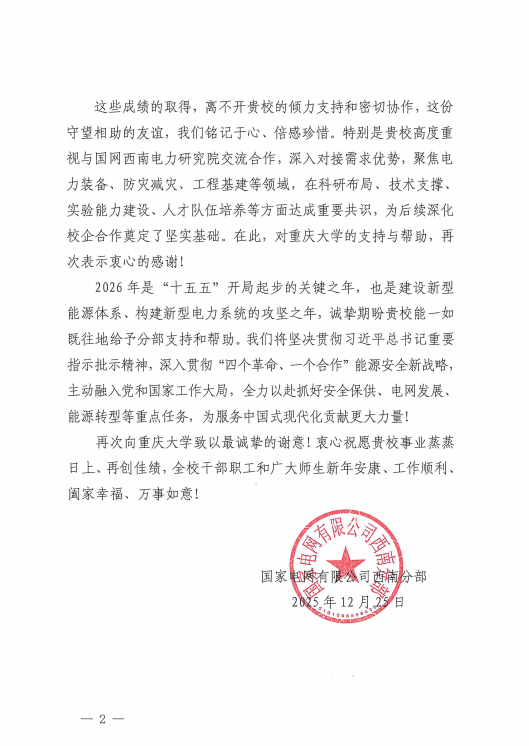 近日,国家电网有限公司西南分部给重庆大学发来感谢信。感谢我校高度重视与国网西南电力研究院交流合作,深入对接需求优势,聚焦电力装备、防灾减灾、工程基建等领域,在科研布局、技术支撑、实验能力建设、人才队伍培养等方面达成重要共识,为后续深化校企合作奠定了坚实基础。