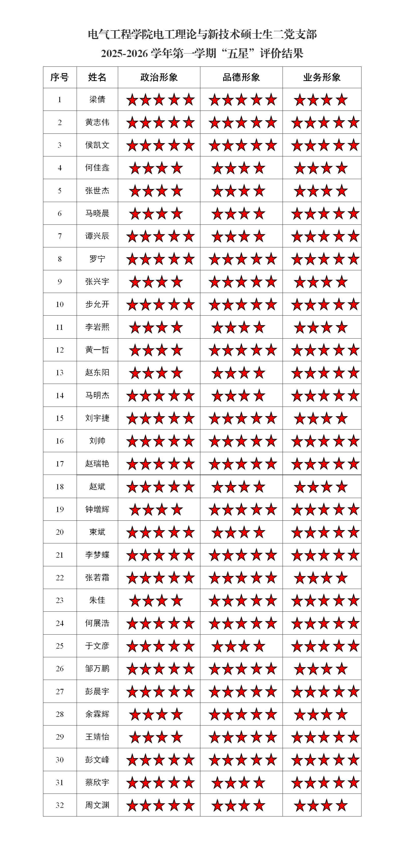 电气工程学院博士生一党支部2025-2026学年第一学期“五星”评价结果